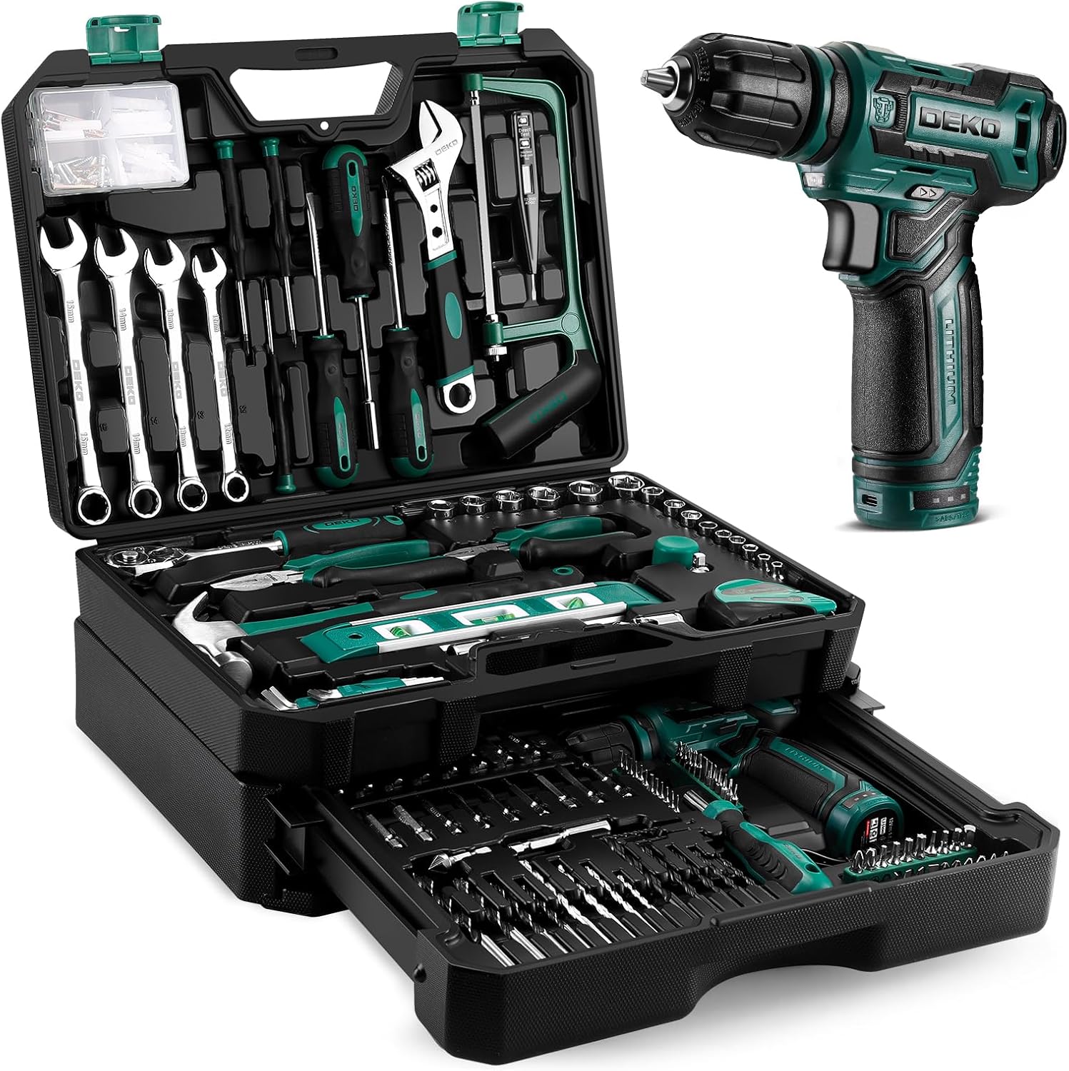 Tool Kit Box Drill Set:DEKO 238 Pieces Home Mechanic Toolbox with 12V Power Cordless Drill Hand Repair Tools Sets Combo Kits Storage Organizer Drawer Case for Men(Green)